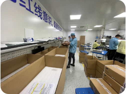 原包裝產(chǎn)線: 包裝工作強度高,需求人力多,包裝錯誤風(fēng)險高 升級后:自動化包裝線 全新的自動化包裝線可進(jìn)行自動包裝作業(yè),包括紙箱的開箱,裝箱,封箱,碼垛等工作,同時包裝線具備掃碼識別,確保產(chǎn)品信息與包裝的一致性。原包裝線6人日產(chǎn)300臺,現(xiàn)包裝2人日產(chǎn)500臺。每日包裝效率提升5倍。 智能立庫項目