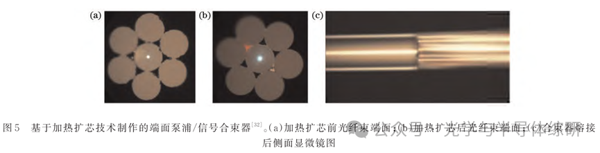 2015年,國防科技大學(xué)報(bào)道了借助加熱擴(kuò)芯技術(shù)來減小信號插損的一種端面信號泵浦合束器。實(shí)驗(yàn)中用到的泵浦光纖為六根尺寸為105/125μm的光纖,輸入信號光纖為單模SMF28光纖,輸出光纖尺寸為25/250μm。合束器的泵浦耦合效率大于96%,但由于合束器輸入輸出信號光纖纖芯尺寸差別巨大,其信號通過率只有51%。為了提高合束器信號光通過率,研究人員使用氫氧焰對信號纖加熱30min,使SMF28光纖纖芯明顯擴(kuò)大,然后再進(jìn)行相應(yīng)的組束拉錐過程,如圖5(a)和5(b)所示,擴(kuò)芯后合束器的信號通過率上升到94%,為后續(xù)輸入輸出光纖纖芯尺寸不同的端面泵浦/信號合束器的制作提供了一個有效解決方案。
